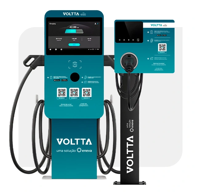 As franquias Voltta Energy oferecem soluções completas de eletropostos modulares, com cinco formatos: MINI (2 vagas DC), STANDARD (2 DC + 1 AC), PLENA (2 DC + 2 AC), PERSONALIZADA (módulos customizados) e FROTA (projetos para frotas de caminhões).