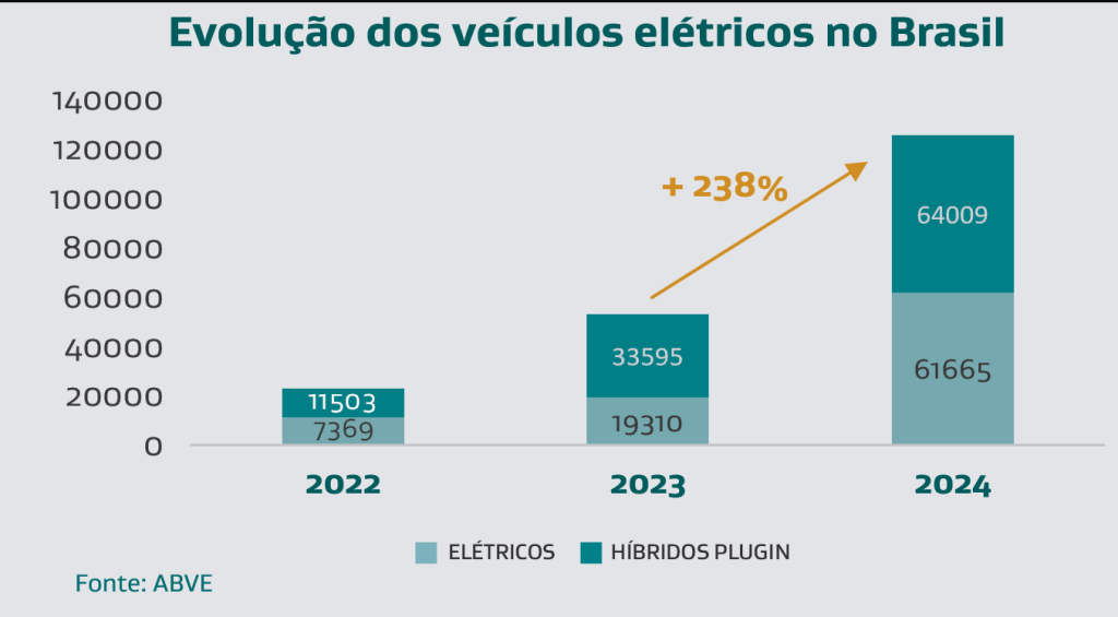 Entre 2022 e 2024, o volume total de veículos elétricos (e híbridos plug in) aumentou em impressionantes 484%, saltando de 18.772 unidades para 125.674. Somente os veículos 100% elétricos cresceram aproximadamente 319,4% de 2023 para 2024.